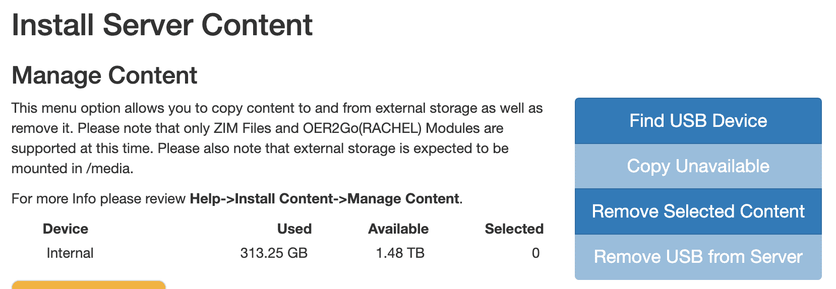 Your IIAB dashboard is accessible at http://box.local/admin. You can find available content by navigating to the “Install Content” menu to browse through ZIM files and OER2Go modules. With your external hard drive running the entire installation, you should have ample space to install information to your heart’s content. To verify that your storage is hooked up correctly, you can go to “Manage Content” inside the “Install Content” menu to see your available space.