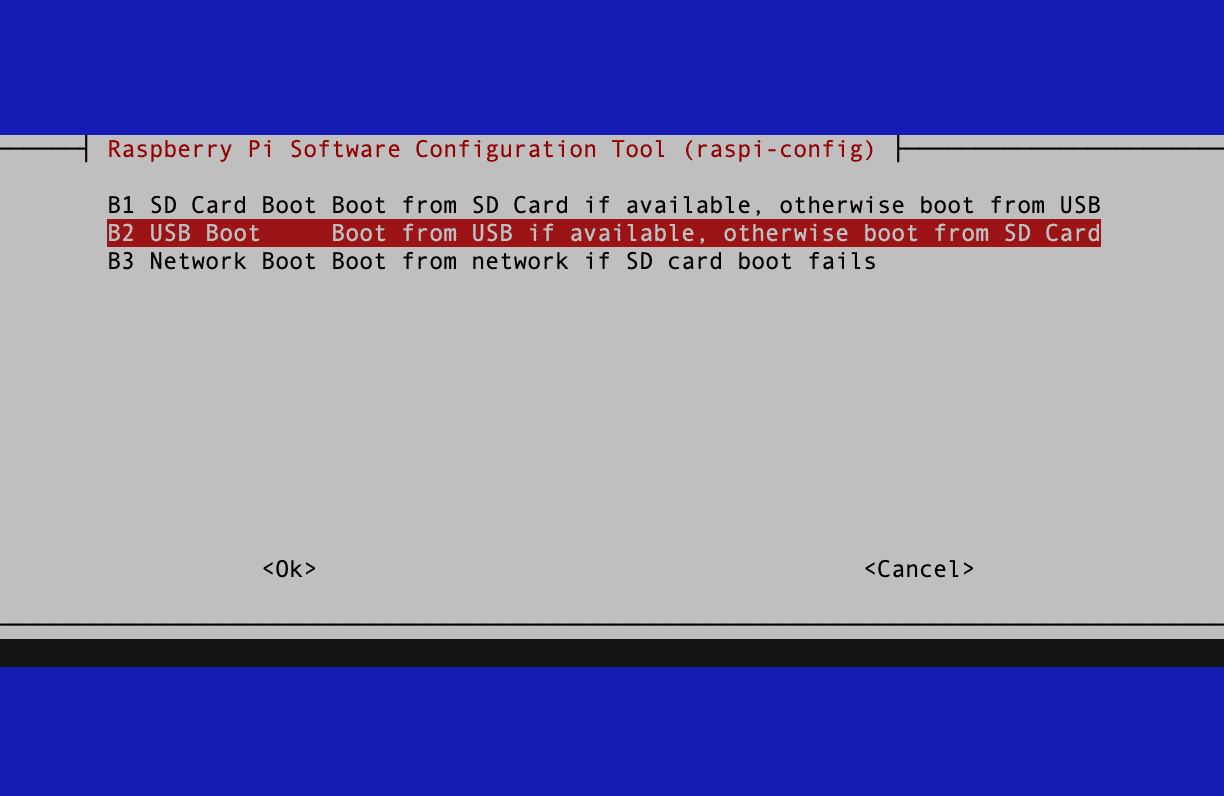 Once your Pi is booted up, run sudo raspi-config or open the config tool via the GUI if you're using a screen. The specific option that we're looking for is under Advanced Options > Boot Order. We want our Pi to boot from the USB, so we select "USB Boot".