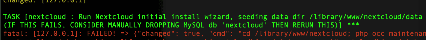 To fix that error, login to MySQL by running sudo mysql. Once logged in, check that the NextCloud database exists by running SHOW DATABASES;. If it’s there, delete it by running DROP DATABASE nextcloud;, exit MySQL, and then run sudo iiab to attempt the installation again.