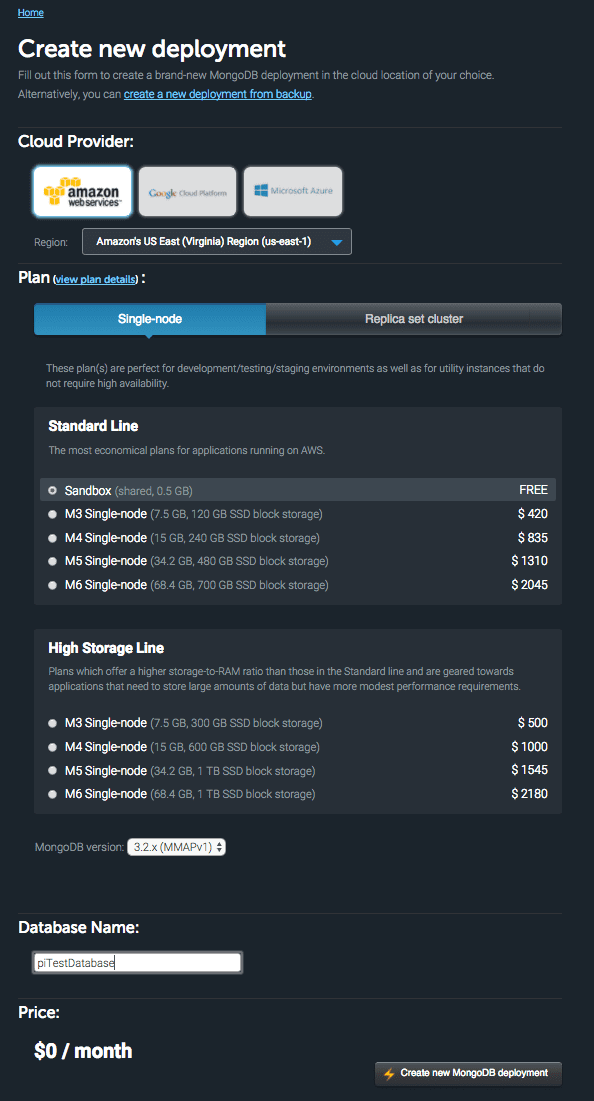 I prefer to run my instances on AWS, but you can also run on Google Cloud or Microsoft Azure. For this tutorial, let's select AWS. You can pick what region you'd like to run your AWS instance from, but for general-purpose applications, the default of US-East-1 is pretty solid. Click "single node" to reveal the smaller options, and then click "sandbox" to choose our deployment type. There's only one version of MongoDB available for sandbox accounts, so you can just let the version stay as-is. The last thing we need to do is come up with a name for our database–let's call ours "pi_test_databse".