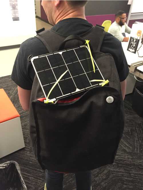 We decided to go with an iPad-sized six watt panel from Voltaic. The panel was designed for rugged use, and came with a connector that we could easily modify to feed into our prototype. We learned our first lesson by testing how long the panel took to charge the USB battery pack that came with the panel. I was on my bike that day, so I decided to strap the unit to my backpack and see if we could charge the battery at all on my ride home.