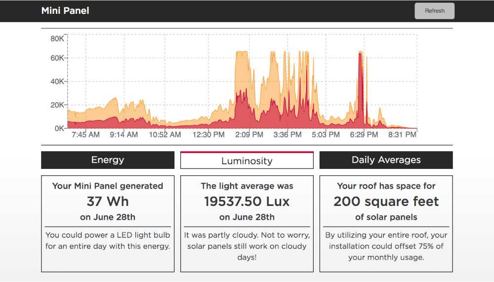 I got home and saw zero charge. I left the panel out in the backyard for two more hours, but still barely got any charge on the battery. The key lesson there was that solar can be extremely slow. We would need to visualize the data in real-time in order to keep a customer engaged.